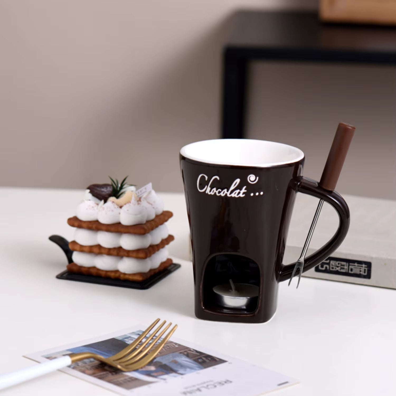 Ciesz się pysznym fondue w domowym zaciszu dzięki naszemu zestawowi do roztapiania czekolady. Kubek wyposażony jest w miejsce na świeczkę, które pozwala utrzymać czekoladę w idealnej temperaturze oraz specjalny haczyk do nabijania owoców i słodyczy.